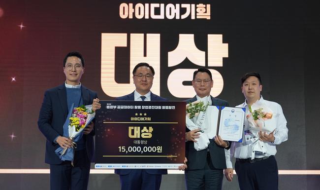 배일권 행정안전부 공공데이터국장이 13일 오후 광주 김대중컨벤션센터에서 열린 `제12회 범정부 공공데이터 활용 창업경진대회 왕중왕전`에 참석해 아이디어 기획 부문 대통령상 수상자와 기념 촬영을 하고 있다.