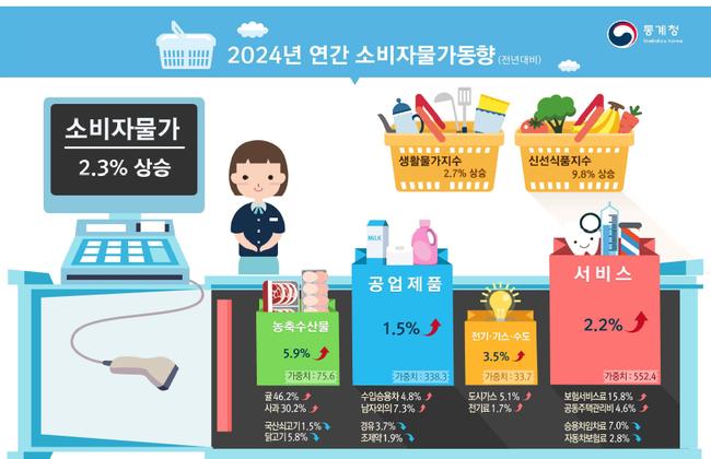 통계청은 2024년 연간 소비자물가지수가 전년 대비 2.3% 상승했으며, 신선식품지수는 9.8% 급등하고, 전기·가스·수도 요금이 3.5% 인상되었다고 31일 발표했다.
