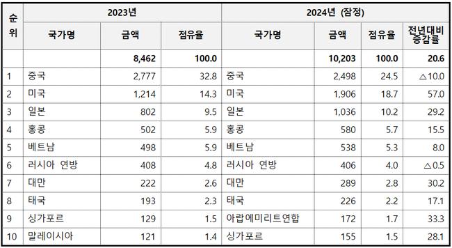 2024년 국가별 수출액 순위에서는 중국이 24.5%(25억 달러)로 1위를 유지했지만, 비중이 처음으로 20%대로 낮아졌다. 반면 미국은 57% 증가한 19억 달러를 기록하며, 수출 증가폭이 가장 컸다. 일본도 10억 달러를 돌파하며 전년 대비 29.2% 상승했다.