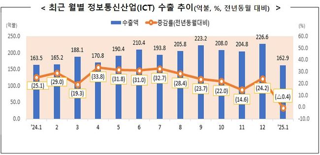 2025년 1월 정보통신기술(ICT) 수출이 162.9억 달러, 수입은 134.5억 달러를 기록해 28.3억 달러의 무역수지 흑자를 달성한 것으로 잠정 집계됐다.