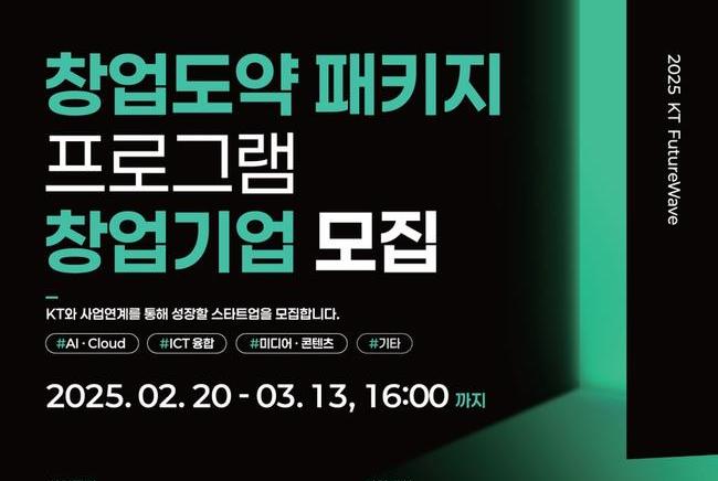 KT(대표이사 김영섭)가 `KT 퓨처웨이브(FutureWave) 창업도약패키지` 모집을 2월 20일부터 3월 13일까지 진행한다고 밝혔다.