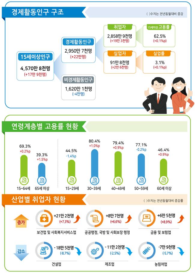 전체 취업자는 2,858만 9천 명으로 전년동월대비 19만 3천 명 증가했다. 산업별로는 보건업 및 사회복지서비스업(21만 2천 명), 공공행정·국방 및 사회보장행정(8만 7천 명), 금융 및 보험업(6만 5천 명) 등에서 취업자가 늘어난 반면, 건설업(-18만 5천 명), 제조업(-11만 2천 명), 농림어업(-7만 9천 명) 등에서는 줄었다.
