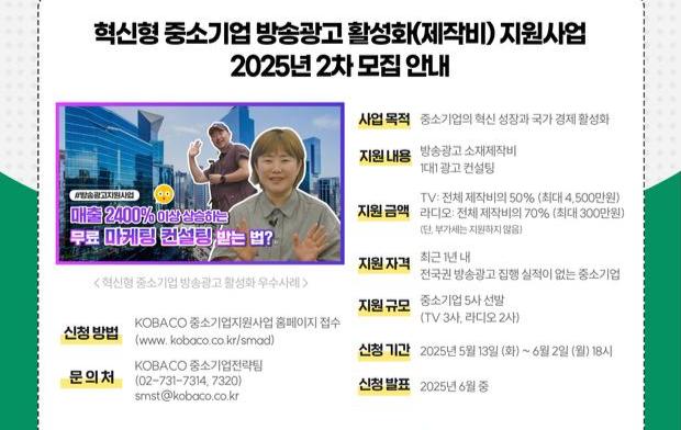 방송통신위원회와 한국방송광고진흥공사는 중소기업의 방송광고 제작을 지원하는 ‘2025년 중소기업 방송광고 지원사업’ 2차 공개모집을 13일부터 시작한다고 12일 밝혔다.