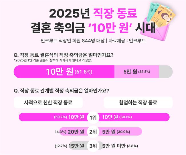 HR테크기업 인크루트(대표 서미영)는 지난 5월 20일부터 22일까지 직장인 844명을 대상으로 설문조사를 실시해 ‘2025년 직장 동료 적정 결혼 축의금’에 대한 인식을 분석한 결과, 가장 많은 응답자(61.8%)가 ‘10만 원’을 적정 금액으로 선택했다고 밝혔다.