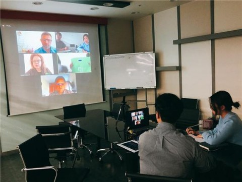 한국콤파스가 온라인 화상회의를 통한 해외 현지 마케팅을 진행하고 있다