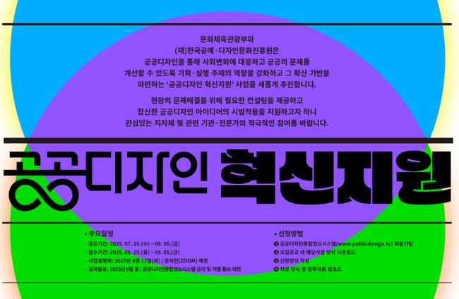 문화체육관광부가 공공디자인을 통해 사회문제를 해결하고 지역 맞춤형 혁신모델을 확산하기 위해 ‘공공디자인 혁신지원’ 사업을 처음으로 추진하며, 오는 8월 25일부터 과제 공모 접수를 시작한다.