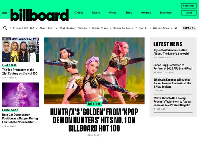 넷플릭스 ‘케이팝 데몬 헌터스’ OST…빌보드 ‘핫100’ 1위 쾌거 - 가상 걸그룹 헌트릭스의 ‘골든’, K팝 여성 가수 첫 정상 기록 - 영국 오피셜 차트 이어 세계 양대 차트 석권…7주 만에 역주행 정상 - 美 스트리밍·라디오·판매량 모두 급상승…글로벌 서머송 자리매김
