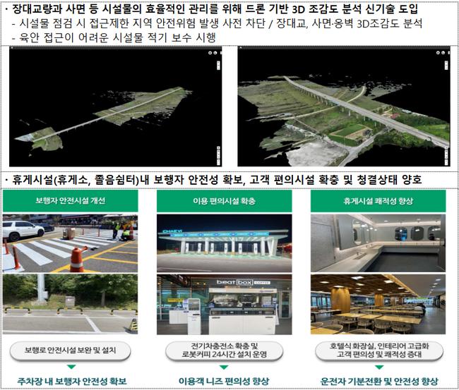 이외에도 서울-문산 고속도로의 드론 활용 점검, 상주-영천 구간의 실시간 결빙 측정 시스템, 평택-시흥 구간의 정체 상황 자동 표출 등 신기술 도입 사례가 늘고 있다. 그 결과 민자고속도로의 교통사고 사망자는 2.4명에서 1.2명으로 절반 가까이 줄었으며, 사고 시 사업자의 현장 출동시간도 8분29초에서 7분54초로 단축된 것으로 분석됐다.