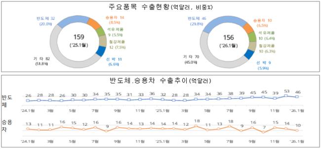 관세청이 12일 발표한 2026년 1월 1~10일 수출입 잠정치에 따르면 이 기간 수출은 156억 달러, 수입은 182억 달러로 각각 전년 동기 대비 2.3%, 4.5% 감소했으며, 무역수지는 27억 달러 적자를 기록했다.
