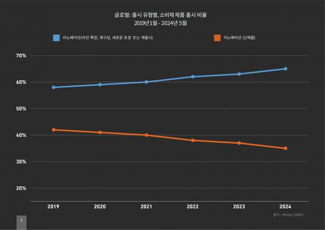민텔의 글로벌 신제품 데이터베이스(GNPD)에 따르면 2024년 첫 5개월 동안 식품, 음료, 생활용품, 건강, 뷰티, 퍼스널케어 및 펫 카테고리의 글로벌 소비재 출시 비율을 조사한 결과, 35%는 진정한 의미의 신제품이었고 65%는 라인 확장, 재구성, 새로운 패키지 또는 품목 재출시와 같은 리노베이션 제품으로 나타났다.