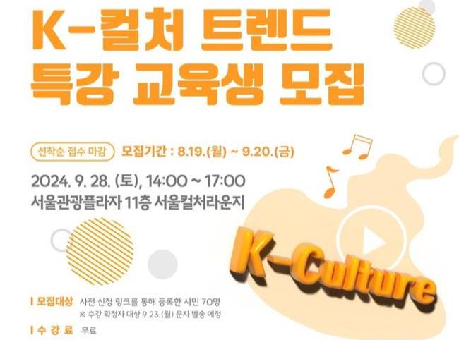 서울관광재단(대표이사 길기연)은 오는 9월 28일(토) 서울관광플라자에서 일반 시민을 대상으로 `세계 속 K-컬처 트렌드` 특별 무료 강연을 진행한다고 밝혔다.