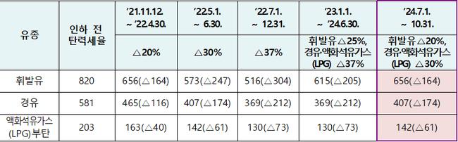 정부는 ’24.8.31. 종료 예정인 유류세 한시적 인하(현행 휘발유 △20%, 경유․ 액화석유가스(LPG)부탄 △30%) 조치를 ’24.10.31.까지 2개월 추가 연장할 계획이다.