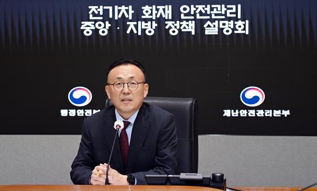 이한경 행정안전부 재난안전관리본부장이 9일 서울 종로구 정부서울청사 상황실에서 열린 『전기차 화재 안전관리 중앙 · 지방 정책 설명회의』를 주재하고 있다.