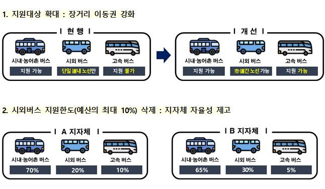 그러나, 시내·농어촌버스 등 단일 광역지자체 내에서만 운행하는 단거리 버스노선만 지원이 가능해, 장거리 이동을 지원하는 데 한계가 있고, 지역 여건에 따른 특수성을 반영하기 어려운 측면이 있었다.