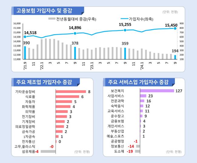 산업별로는 제조업(3만명 증가)과 서비스업(17만 6천명 증가)에서 증가세를 보였다. 서비스업 중에서는 보건복지(12만 7천명), 사업서비스(2만 3천명), 전문과학(1만 6천명) 분야에서 주로 증가했다.