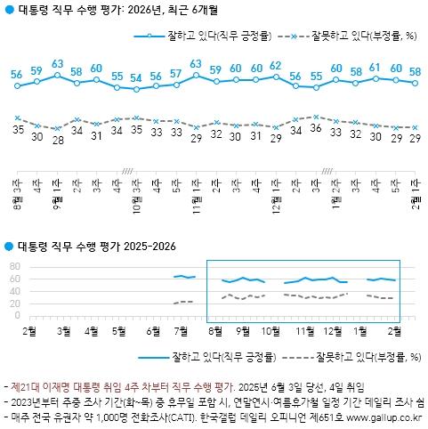 한국갤럽이 지난 3~5일(2월 첫째 주) 전국 성인 1,001명을 대상으로 실시한 조사에 따르면 이재명 대통령 직무 수행에 대한 긍정 평가는 58%, 부정 평가는 29%로 집계됐다. 의견 유보는 12%였다.